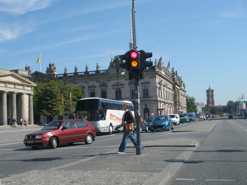 der Ampel die Spitze des Fernsehturms, die Straße heißt 'Unter den Linden'