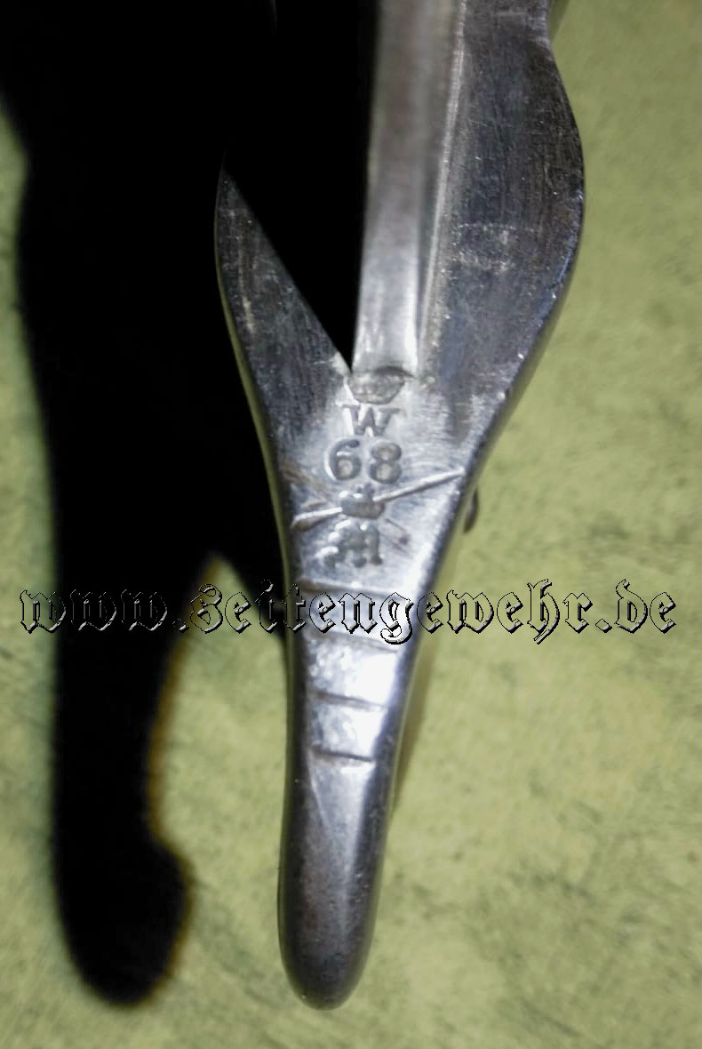 Die Aussage mit „nummerngleich“ muß relativiert werden. Inzwischen sind 2 nummerngleiche Stück belegt – wenngleich mit dem Stempel der I. bzw. II. Werft Division – gekennzeichnet sind. Auf der inneren Parierstangenseite des hier gezeigten M/60 ist noch schwach ein Altstempel auszumachen. Ebenso könnte sich auf dem Mundblech unter dem „S.A.C.-Stempel“ ein weiterer älterer Stempel befunden haben.