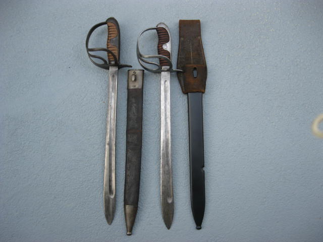 Hier zwei Stücke der II.Torpedodivision.Das besondere ist der Streifschuß an der Metallscheide sowie die originale Tragetasche.