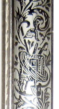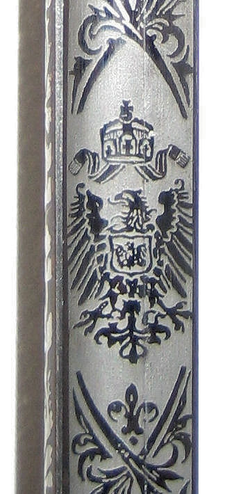 Auf Klinge und Klingenrücken florale Ätzungen mit Tornister, Säbel, Seitengewehr, Musikinstrumenten ... und Reichsadler.