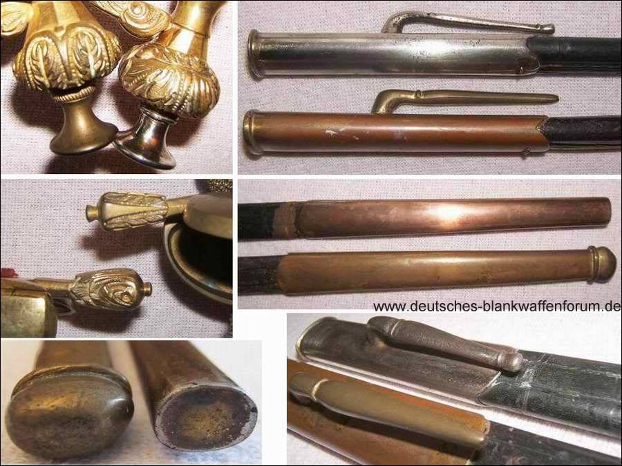das linke Stück ist keine privat beschaffte Offz.-Waffe, sondern eine vom preuß. Militär abgenommene und (von der Waffenkammer) für Portepeeunteroffz. ausgegebene Seitenwaffe; soweit bekannt.