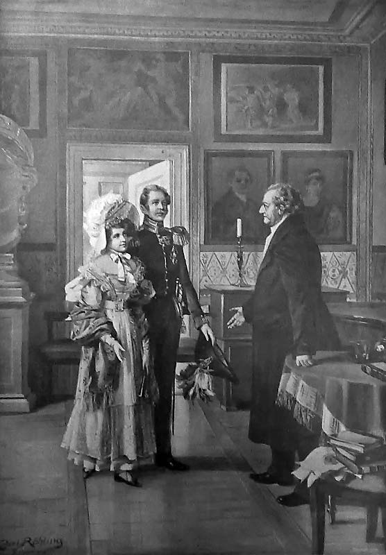 Das spätere erste deutsche Kaiserpaar, Prinz Wilhelm von Preußen (mit IOD a/A) und Prinzessin Augusta von Sachsen-Weimar, zu Besuch bei Goethe (~1829).