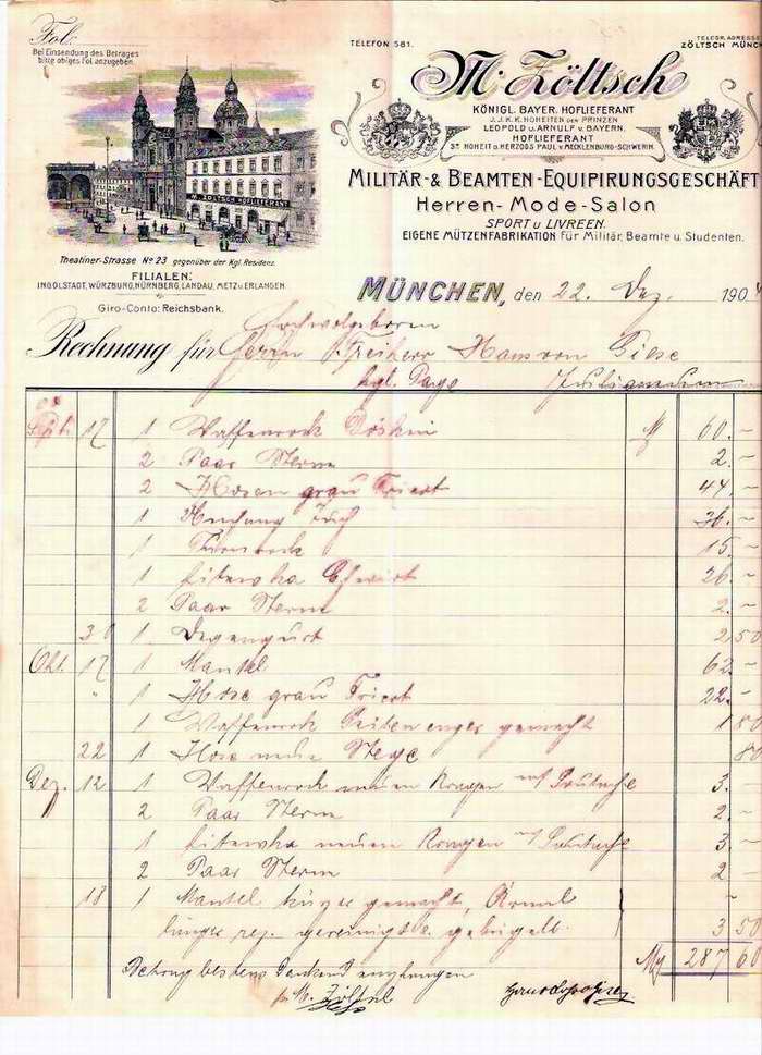 Die Rechnung über Uniformteile stammt aus dem Jahr 1904 und ist ausgestellt von M. Zöltsch, Militär- & Beamten-Equipirungsgeschäft, Herren-Mode-Salon, Sport und Livreen, Eigene Mützenfabrikation für Militär, Beamte und Studenten.