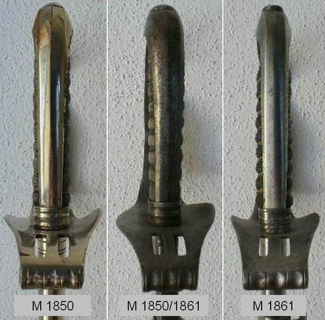 Einen "reinen" M1850 erkennt man daran, daß das Gefäß auf der linken Seite länger& nach oben gebogen ist, um den Daumen besser zu schützen. Meist ist die Klinge wuchtiger, mit breitem Rücken und die Fehlschärfe ist kürzer.