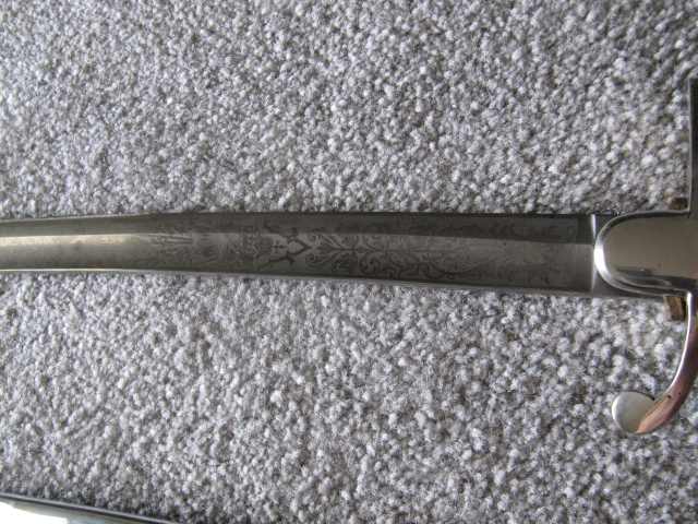 Bei HelmutWeitze Militärische Antiquitäten habe ich einen Säbel mit der selben Ätzung gesehen, allerdings ist der Ring lose und die Scheide dunkel lackiert. Als hersteller wird WKC angegeben.