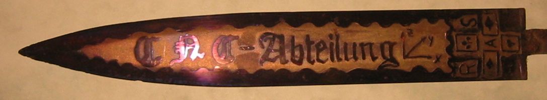 Da ich kein Sütterlin auf dem Rechner hatte, nahm ich Old English und druckte mir ein paar Zeilen in verschiedenen Größen aus. Mit einem feinen Pinsel malte ich frei Hand die Schrift auf die entfettete Klinge. Ich nahm Asphaltlack und als Säure ein Gemisch aus Salpeter und Salzsäure (ich hatte es halt eilig bitte, bitte nicht nachmachen, es entstehengiftige Gase, die Lungenschäden verursachen können!!!.