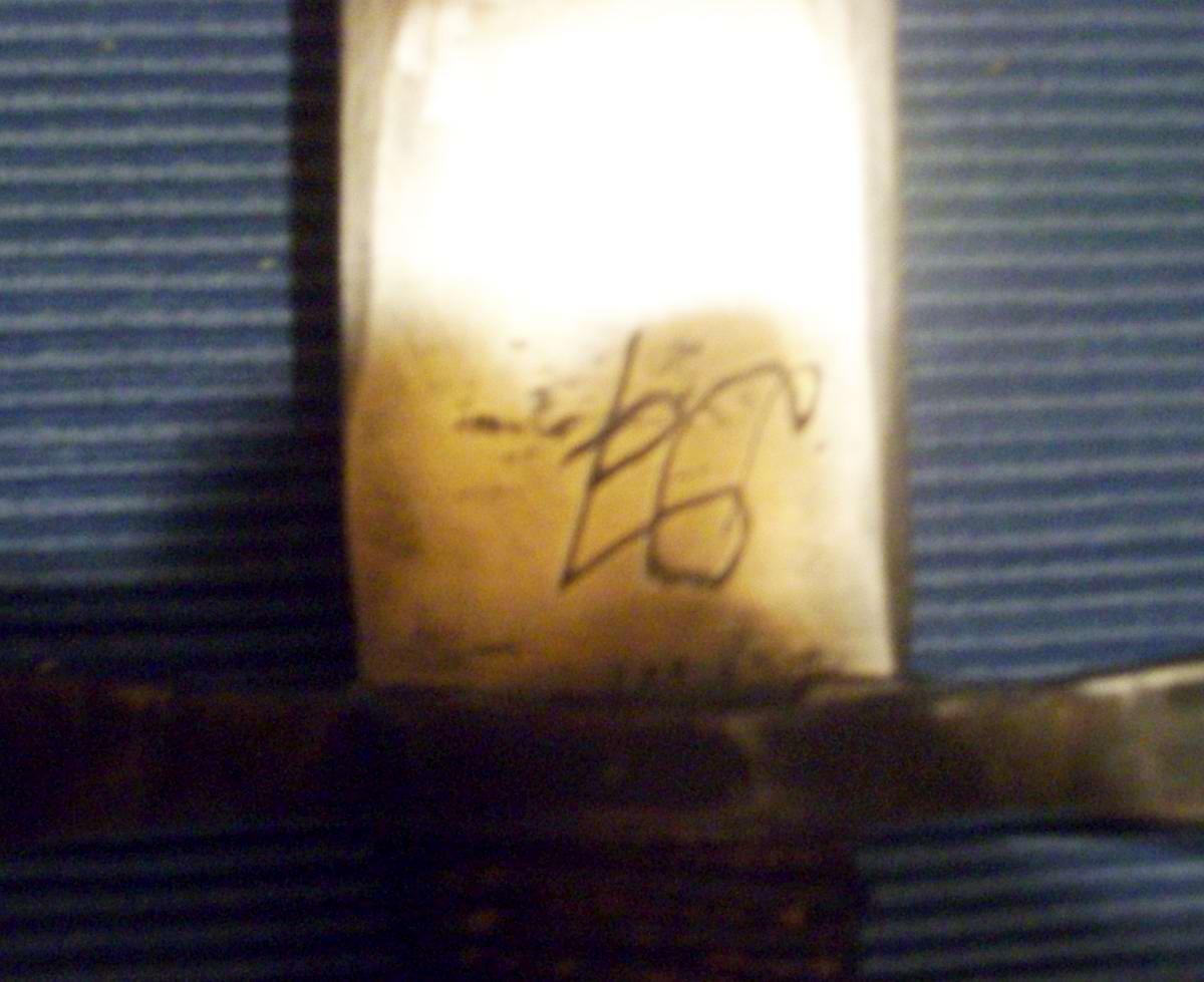 Ich habe ein Schwert gefunden, dass vielleicht vielversprechend sein könnte. Ich habe die Initialien fotografiert, ebenso wie die Waffe an sich.