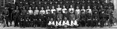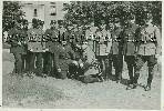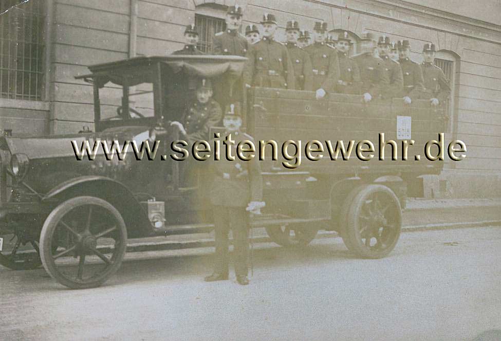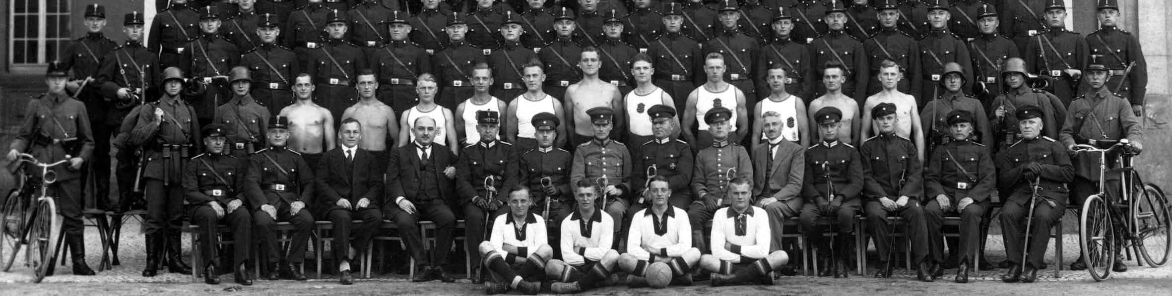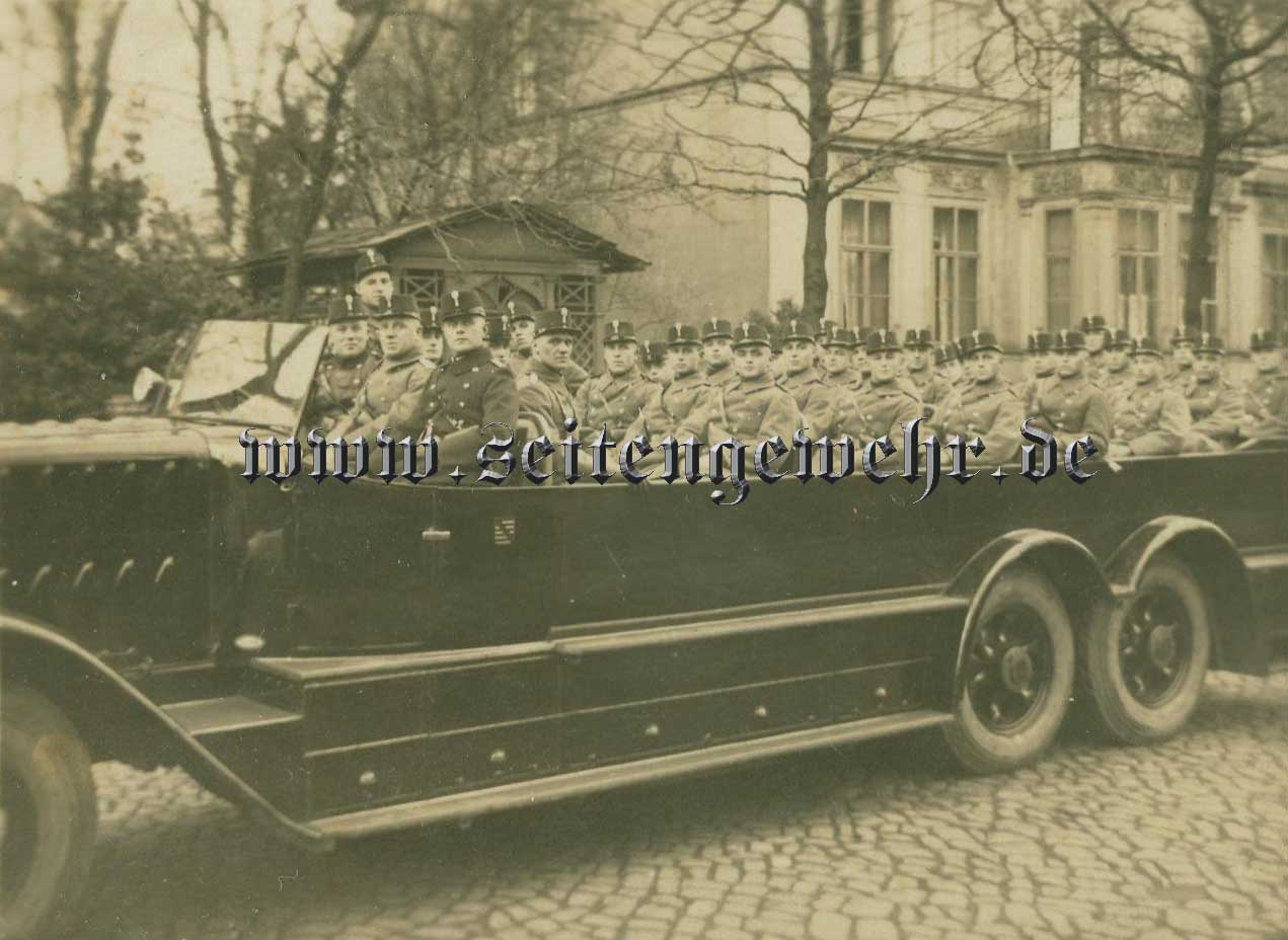 Hundertschaft der sächsischen staatlichen Polizei um 1925. Interessant sind hierbei auch die unterschiedlichen Uniformierungen und Bewaffnungen. Mit dabei u. a. Infanteriesignalhörner, Handgranaten und Dienstfahrräder.