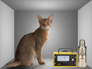 " In einem geschlossenen Raum befindet sich ein instabiler Atomkern, der innerhalb einer bestimmten Zeitspanne mit einer gewissen Wahrscheinlichkeit zerfällt. Der Zerfall des Atomkerns werde von einem Geigerzähler detektiert. Im Falle einer Detektierung werde Giftgas freigesetzt, was eine im Raum befindliche Katze tötet.