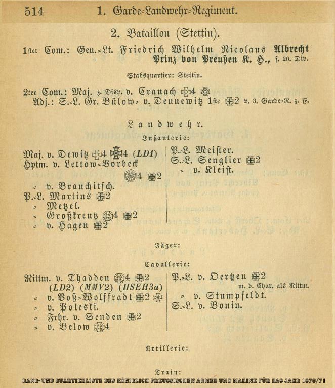 Siehe "Eintheilung und Standquartiere der deutschen Reichs-Armee mit namentlicher Angabe der Corps-,Divisions-,Brigade-,Regiments,Bataillons-und Landwehr-Bezirks-Commandeure"