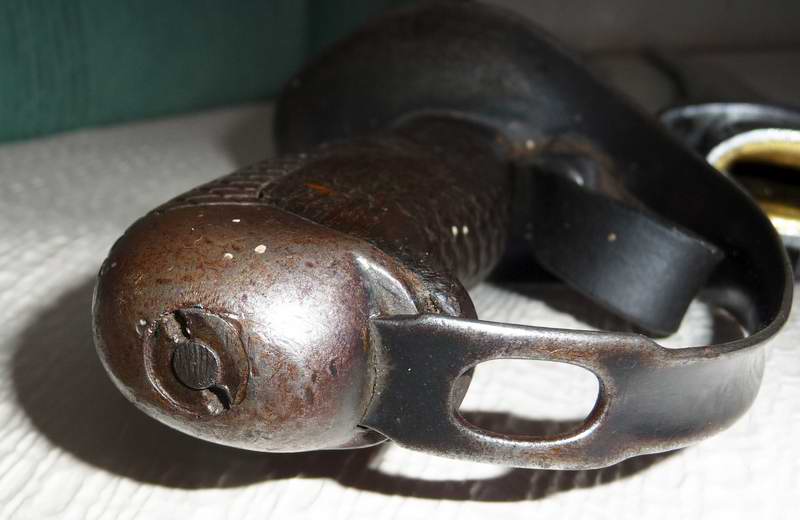Griffdetails. Griffkappe mit Hilze und Angel mit einer Querschraube verschraubt.