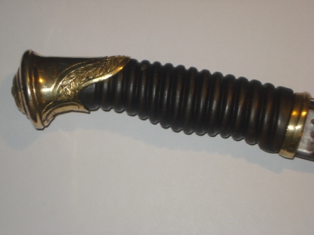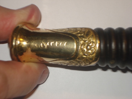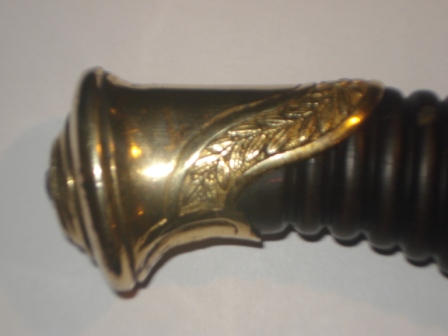 Griffhülse ist aus Holz.Griffkappe ist aus Messing,verziert mit Lorbeeerblättern und einer Blume in der Mitte.Der Knauf ist genietet.