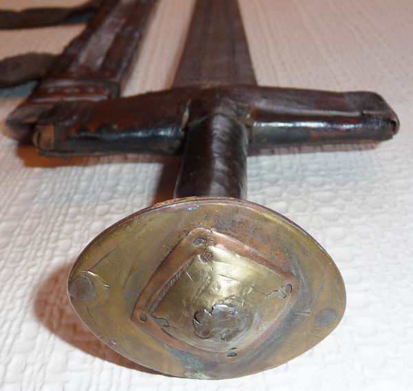 Der metallene Griff ist komplett, inklusive Parierstange, mit Leder bezogen. Der Knauf besteht aus Blechen verschiedenster Materialien. Es findet sich Eisen, Kupfer und Messing darunter. Die Metalle wurden vernietet und/oder verlötet.