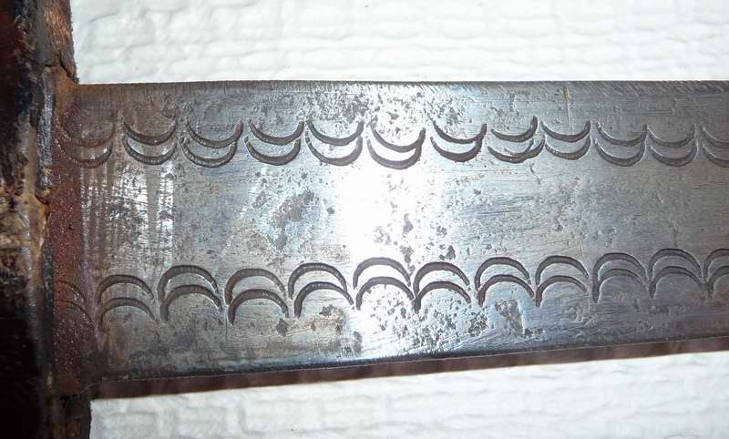 Handgefertigte Klinge mit mondförmigen Vertiefungen. Vom Griff bis zur abgerundeten Spitze verjüngt sie sich gleichmäßig.
