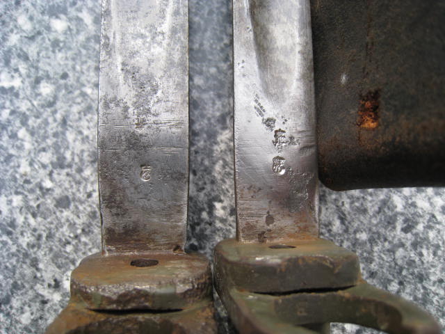 hier zwei weitere Aushilfsseitengewehre vom selben Typ.Die unteren Stempel sind dt.Ursprungs.Die darüberliegenden Stempel sind nicht unbedingt deutsch, zu engl.kann ich mich aber nicht durchringen.Eins davon (li.)gebe ich ab.