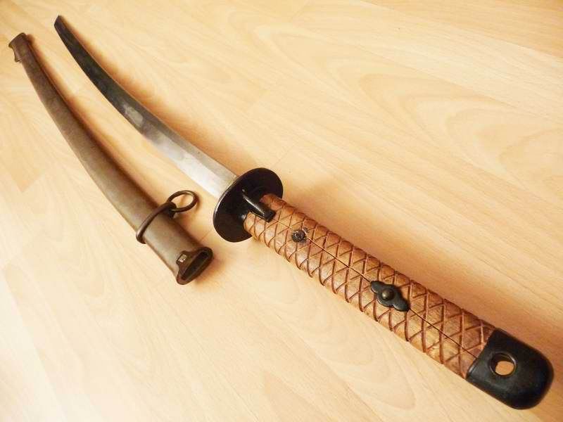 Mangels Material und Zeit wurde die Tsuka (Griff) aus Holz gefertigt. Sie ist mit zwei Querverschraubungen mit der Nakago (Angel) verschraubt. Die Unterlegscheiben besitzen an den verlängerten Enden dornartige Fortsätze, die sich in das Griffholz drücken. Dieser Umstand hat bei den meisten Griffen das Holz gespaltet.