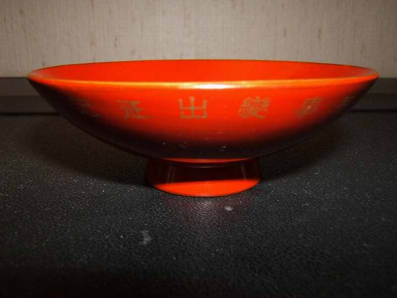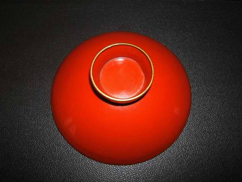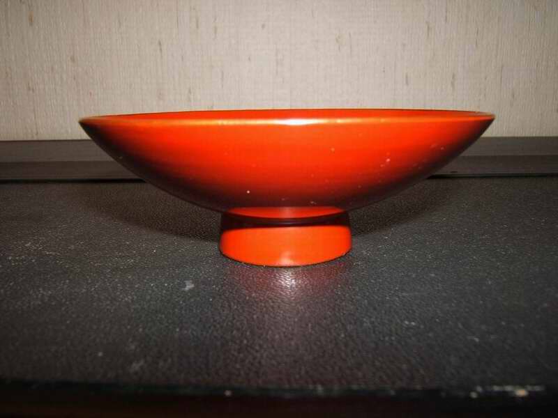 Farbe: Rotbraun lackiert, mit goldenen Rändern oben und am Fuß
