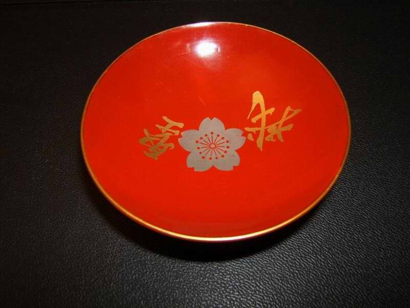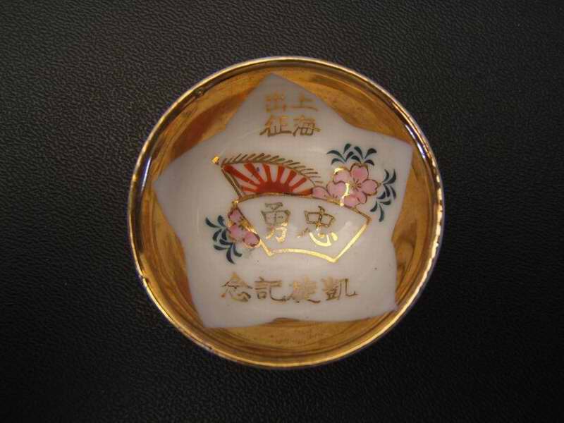 Darstellung: Kirschblüten und Kriegsflagge, sowie japanische Schriftzeichen, seitlicher blauer Kirschblütenstempel mit Schriftzeichen, unter dem Fuß kleine Schriftzeichen