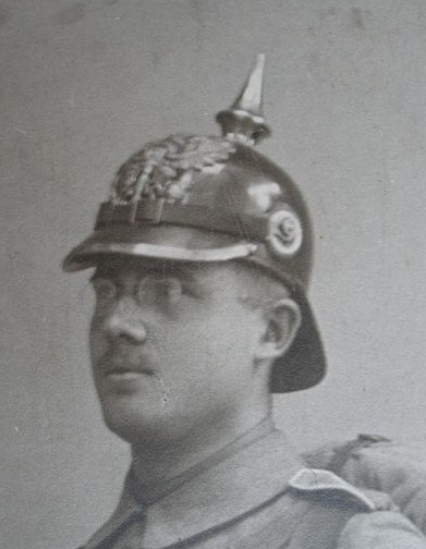 Nachgerüstet mit dem sogenannten Knopf 91 zur Befestigung des Kinnriemens und Kokarden wie ab 1897 getragen.