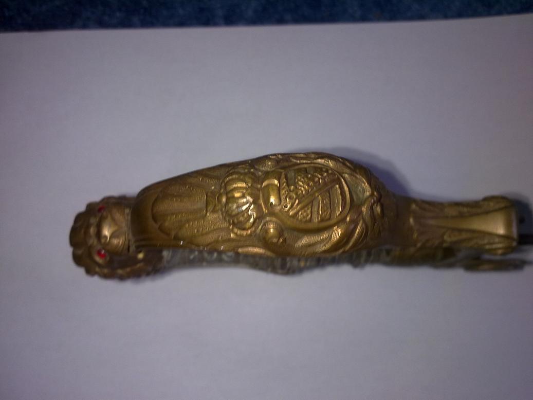 ich habe ein Foto mit so einem Löwenkopfsäbel mit gerader Klinge am Sattel, allerdings mit einem Tragering.
