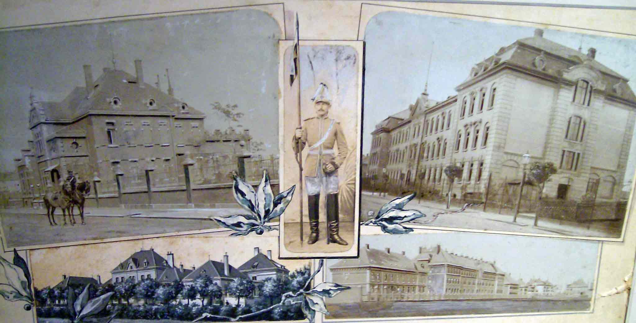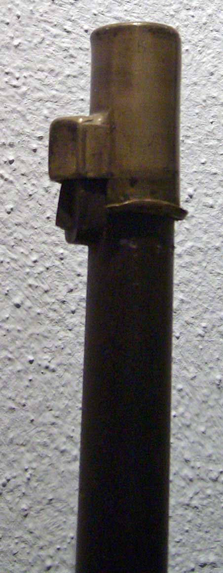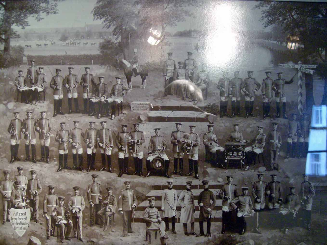 Treppenaufgang mit Karabinier und Schußwaffen. Interessant auch beim aptierten Chassepot-Karabiner M/73 (sächsisch?) der Mündungsschutz.
