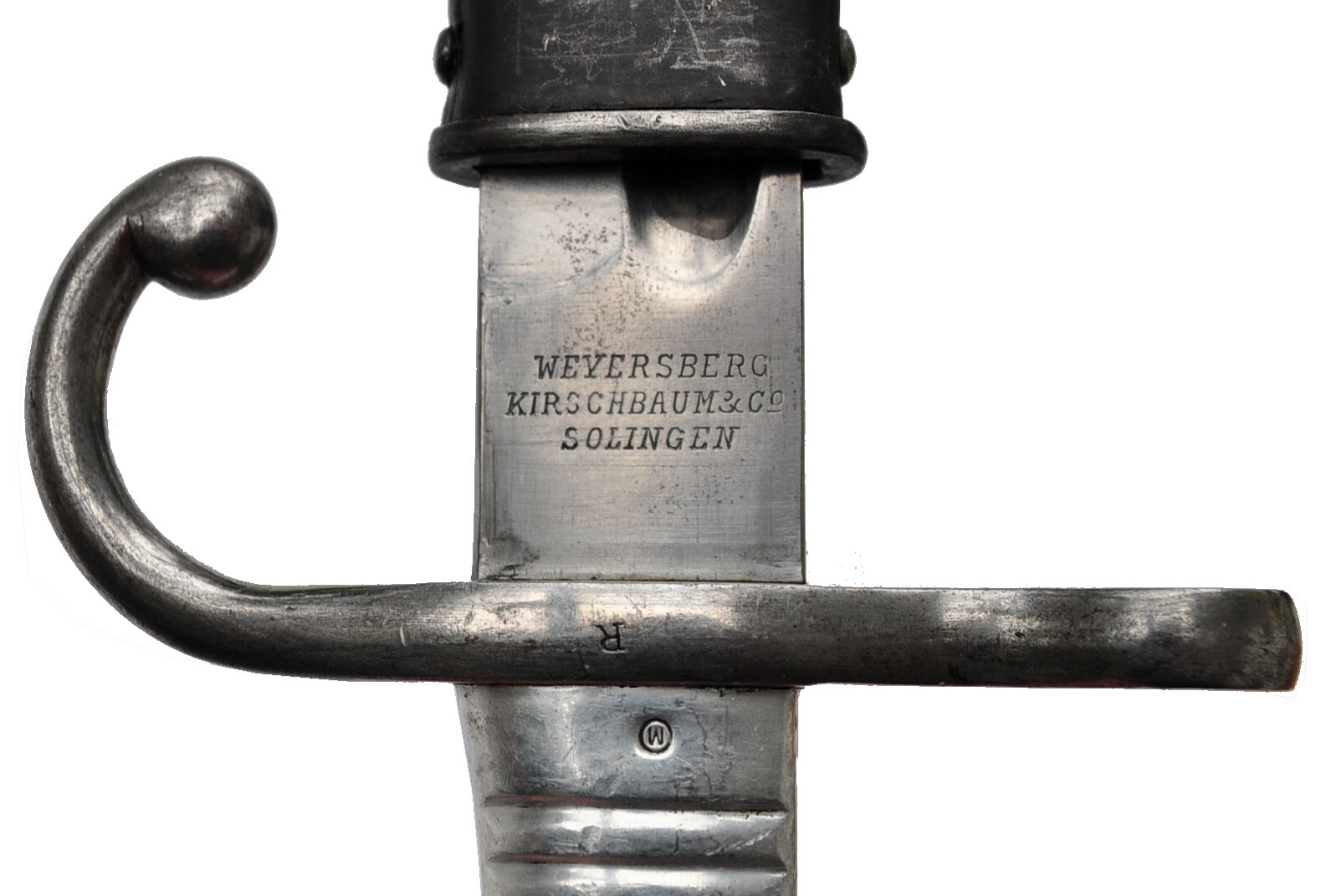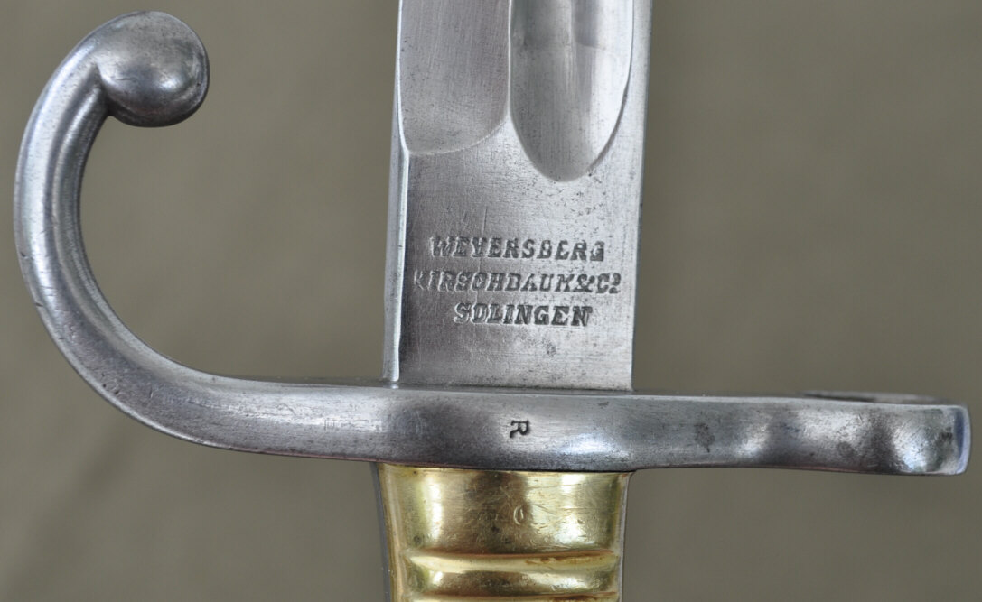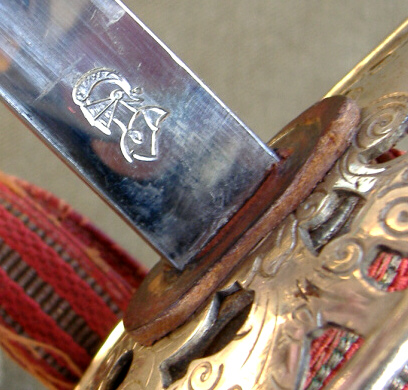 Die Inschrift in lateinischen Buchstaben und die Stücknummer auf der Parierstange