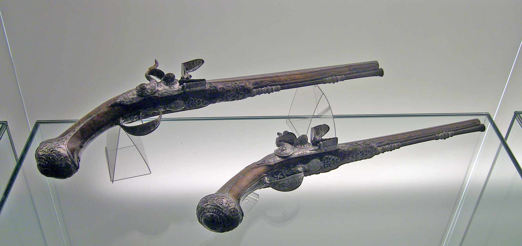 Ein interessantes Pistolenpaar. Je nach Blickwinkel wird aus dem Papst (auf der Griffkappe) der Teufel.