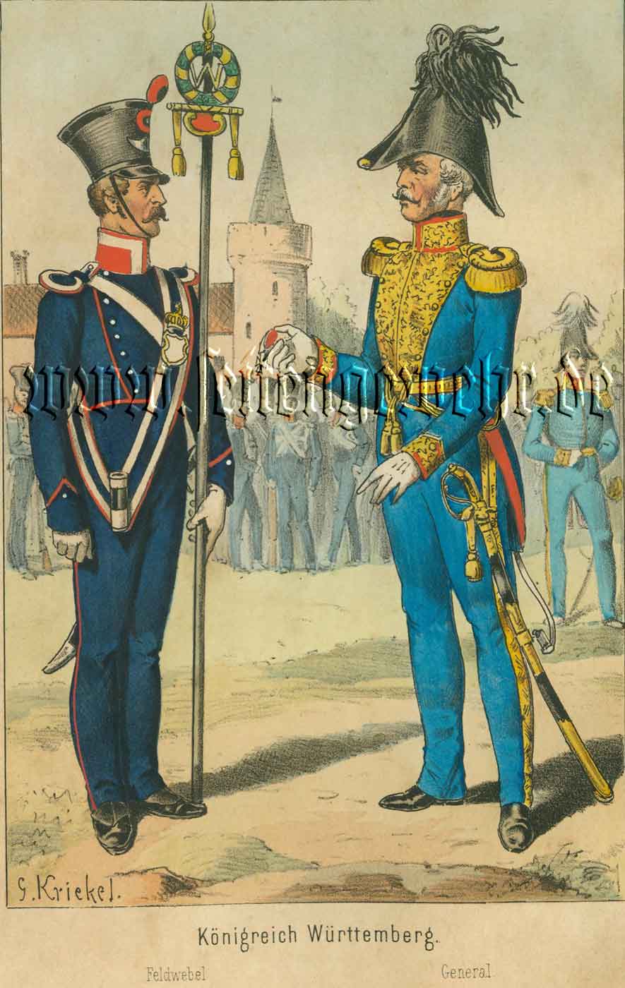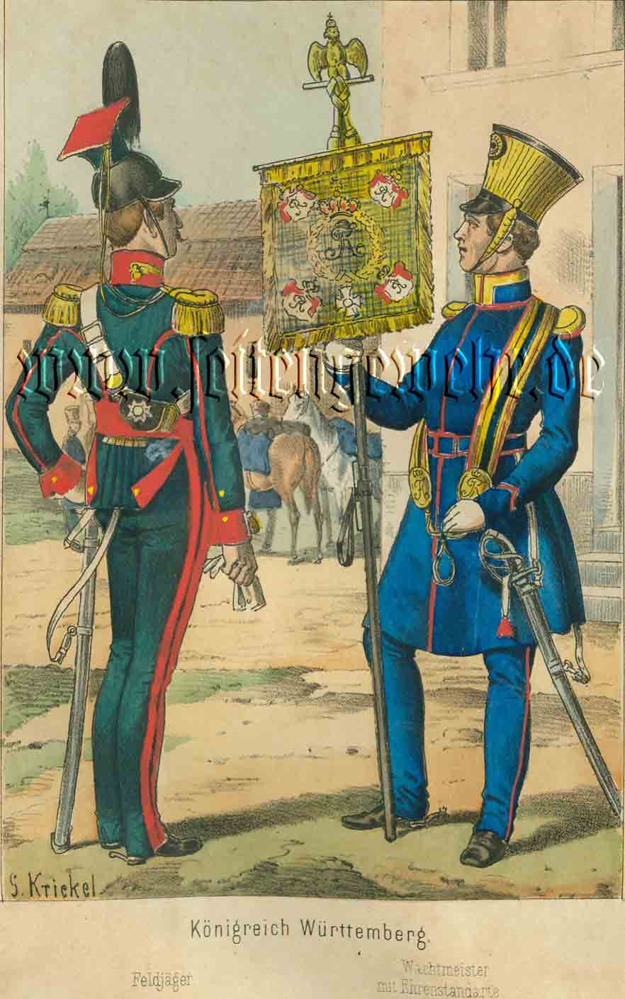 Beide Bilder betreffen das Königreich Württemberg. Zum einen der General (1829) bei der Ordensverleihung an einen Feldwebel (1821) und zum anderen der Feldjäger (1815) zusammen mit einem Wachtmeister mit Ehrenstandarte (1817).
