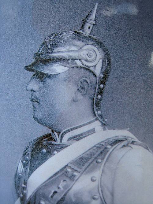 Der Helm ist jedenfalls ein Eigentumsstück. Auf dem Detailfoto sieht man die 1894 eingeführte Befestigung der Schuppenketten, den Knopf 94, und die preußische Kokarde in Offiziersausführung an der linken Helmseite. Dort saß die Kokarde seit der Einführung der Reichskokarde 1897.