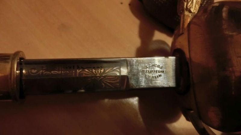 Im Bild links: Lieferantenstempel auf einem Degen für Postbeamte, welcher vom Hersteller WK&C stammt. Der Stempel ist etwas aus der Klingenmitte, und deshalb unvollständig zu lesen.