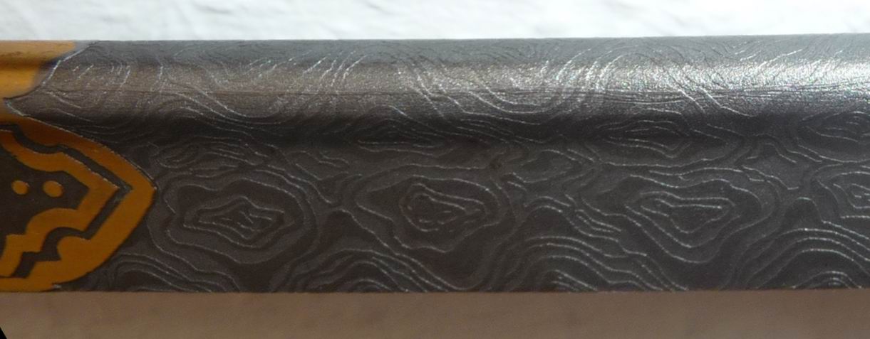Dadurch sind beim geätzten Damast auch auf dem Klingenrücken weiterführende, und so gar umlaufende, Muster zu erkennen.