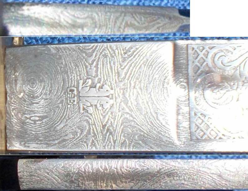 Anbei zwei zusammengestellte Abbildungen eines Ausschnittes (Fehlschärfenbereich) einer Ätzdamastklinge. Das Muster geht um die Klinge herum. Diese Art der Verzierung ist ausschließlich mit Schablonen möglich. Unmöglich, dieses schmiedetechnisch hinzubekommen.