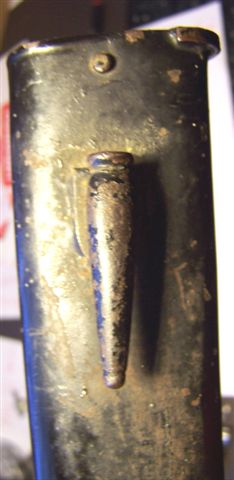 Stahlscheide mit Reste einer schwarzen Lackierung und Tragehaken.