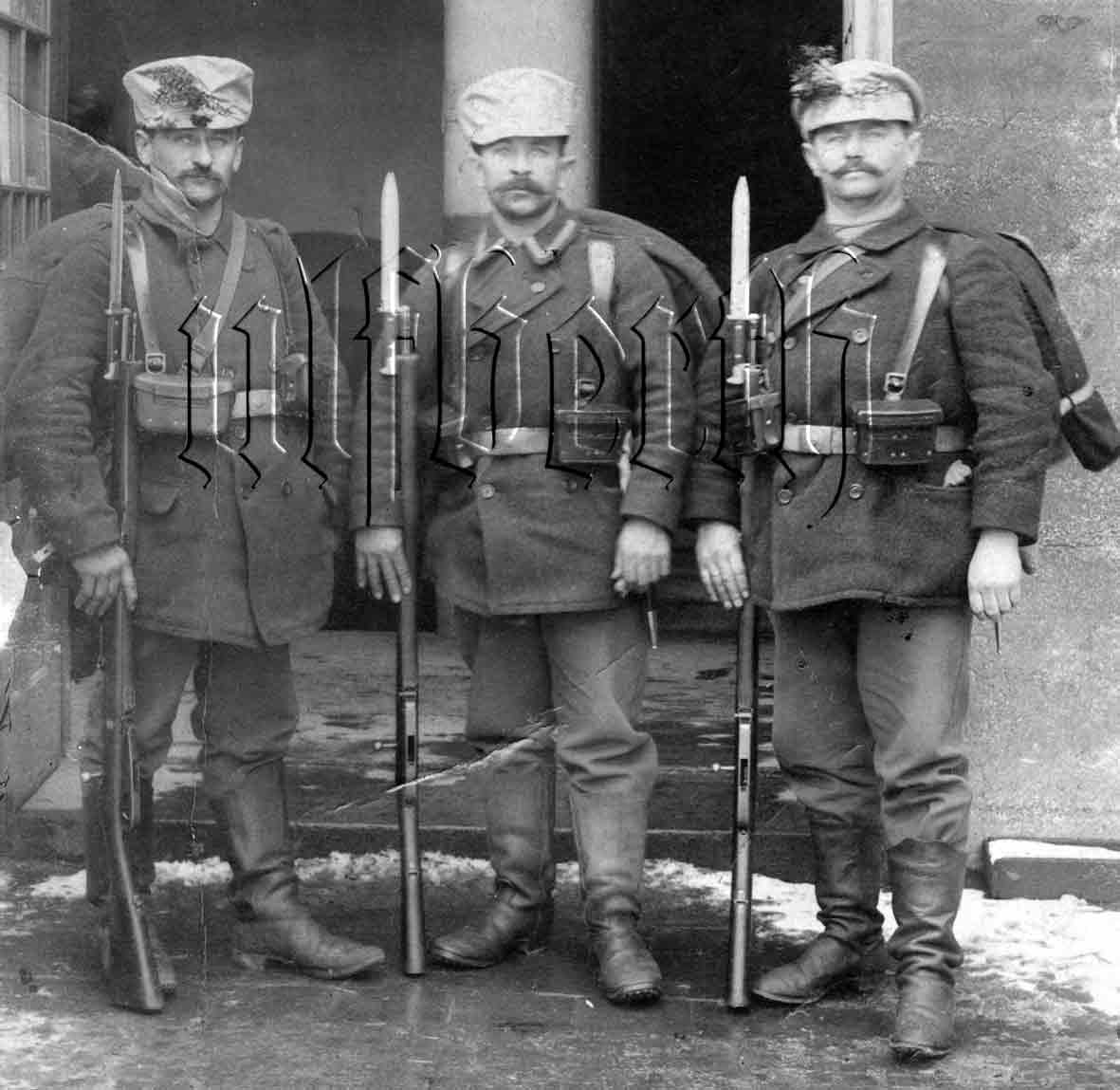 Landsturmmänner vom II. bayerischen Landsturm Infanterie-Bataillon München 1914 in zivilen Joppen mit Wachstuchmützen und Überzug. Der mittlere Soldat mit Unteroffizierstressen am Kragen. Links die Patronentasche 87/88, die beiden rechten Soldaten mit der Patronentasche 95. Als Bewaffnung Gewehr M/88 mit aufgepflanztem Seitengewehr 71/84.