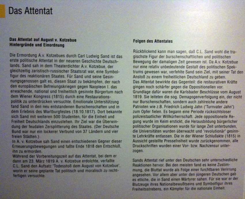 Wunsiedel, hingerichtet am 20. 5. 1820 in Mannheim. Der unter dem Einfluß von K. Follens stehende politische Schwärmer erdolchte am 23. 3. 1819 den Lustspieldichter A. von Kotzebue. Er sah in ihm einen russischen Spion und Hauptverantwortlichen für die Reaktion in Deutschland sah. Seine Tat gab Anlaß zur Demagogenverfolgung und zu den späteren Karlsbader Beschlüssen.