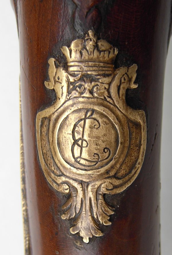 Nussbaum-Vollschaft mit Hornabschluss am Vorderschaft. Messingbeschläge, diese bestehend aus zwei Ladestockröhrchen, Abzugsbügel, Kolbenkappe mit langen seitlichen Sporen, Schlossgegenblech für drei Schrauben und Daumenblech mit dem bekrönten und ligierten Monogramm „EL“ von Landgraf Ernst Ludwig (1678-1739) von Hessen-Darmstadt. Auf der gesamten Länge runder Lauf mit Kanellierungen am Laufende und im hinteren Laufviertel. Kimme in das Schwanzschraubenblatt eingefeilt, Messingkorn auf dem Lauf, 11mm hinter der Mündung. Zwischen den beiden Kanellierungen eine goldeingelegte Marke „Krone über GARDE / D S A“ =