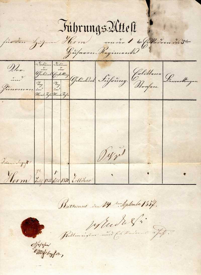 Die erste Unterschrift erfolgte im Jahr 1857. Die zweite Unterschrift stammt aus dem Jahr 1859. Hier war er zur "Mobilmachung".