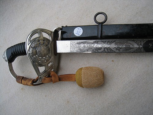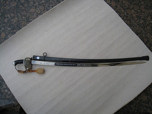 Das Eigentumsstück hat eine vernickelte Rückenklinge mit beidseitiger Hohlbahn. Auf ca, 385 mm geätzt mit militär. Trophäen. Auf blauem Untergrund innen grosse Reiter-Attacke mit dem Hinweis "Ges. Gesch." Aussen in gotischen Buchstaben " 2. Kgl.Sächs. Ulanen-Reg. No.18" (Leipzig 1867). Geschwärzte Stahlblechscheide. Am Gefäß Portepee für berittene Waffenmeister.(für mich immer wieder erstaunlich, diese Art das Portepee so zu binden) der Zustand des Portepee läßt darauf schließen, daß dieses schon Original in der damaligen Zeit angebracht wurde.