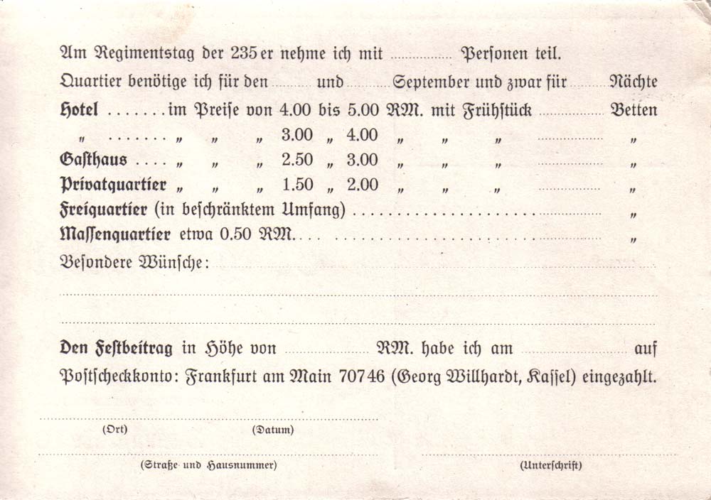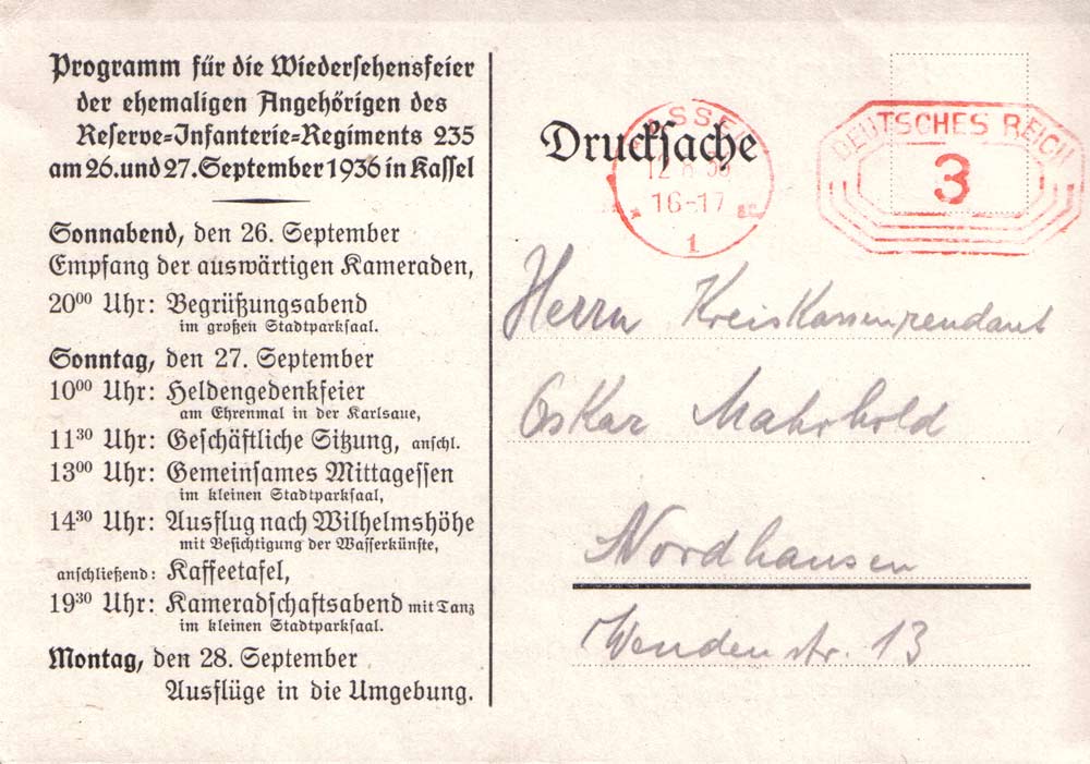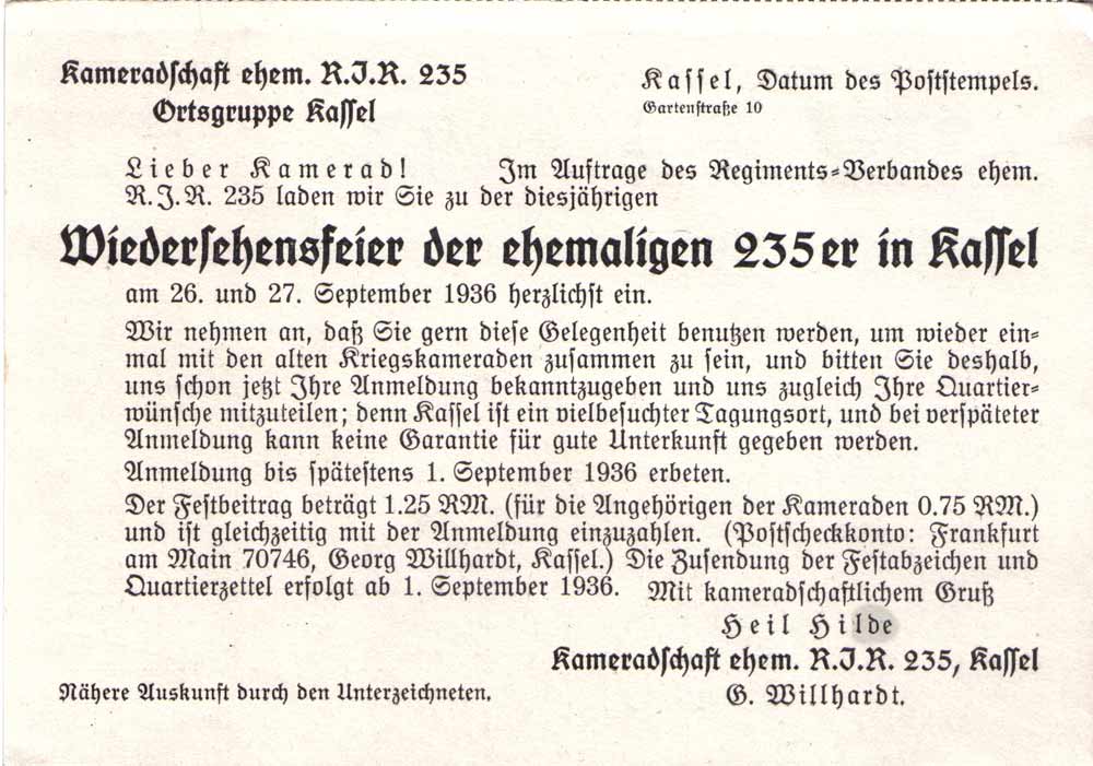Folgend eine Einladung zu einem Reservistentreffen der 235er in Kassel aus dem Jahre 1936.