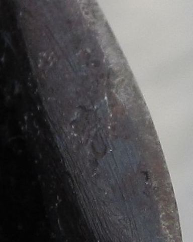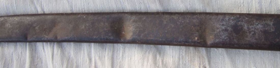 Die Klinge ist nur mit RC unter Krone abgenommen, weitere Abnahmestempel (auch auf den anderen Teilen) sind nicht zu sehen. Die Scheide ist auf dem Schlepper und am Mundblech abgenommen (siehe Bilder). Die Scheide war ursprünglich brünniert, Reste sind noch sichtbar. In der Scheide sind Federstahlstreifen.