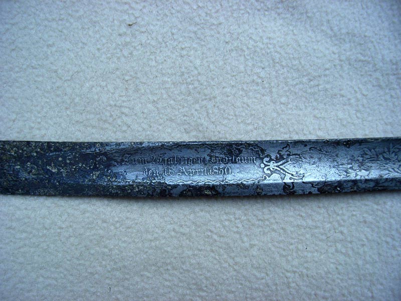 Die Klinge ist auf beiden Seiten graviert, es gibt eine Gravur "Zum 25jährigen Jubiläum den 18. April 1850" auf einer Seite der Klinge und der Hersteller ist Schimmelbusch und Sohn in Solingen.