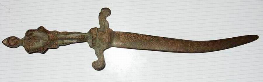 willkommen im Forum. Das Teil scheint aus einem Stück gegossen zu sein und sieht wie ein Brieföffner. Kannst Du uns noch das Material und die Gesamtlänge bekannt geben? Ist die Klinge scharf?
