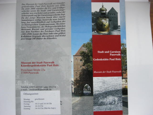 Wer nach Usedom fährt(aus Berlin)der sollte einen kleinen Zwischenstop in Pasewalk einlegen.Im Museum findet man einen kleinen Beitrag zur Garnisonsgeschichte der Stadt.Der größte Teil der milit.Exponate sind Leihgaben des Wehrgesch.Museums Rastatt.Bemerkenswert ist der Pallasch russ.Form.