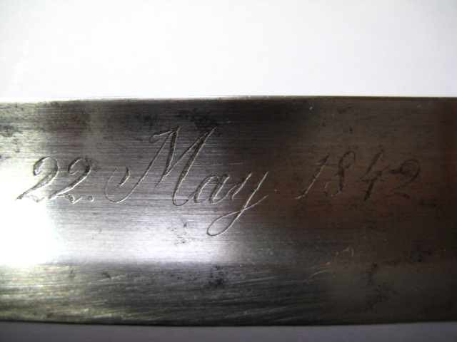 Meine Vermutung geht dahin, dass es sich um einen Baden M56 mit aptierter, ältern badischen Klinge handelt. Ich glaube ich habe die Jahreszahlen 1842 und 1844 schon mal im Zusammenhang mit Baden gesehen, aber wo? - Bürgerwehr ?? Die Klingenvernietung sieht auf jeden Fall alt aus. Die Scheide hat auch nur einen beweglichen Tragering, jedoch ohne den für Baden typischen Buckel - aber sie passt wie angegossen.