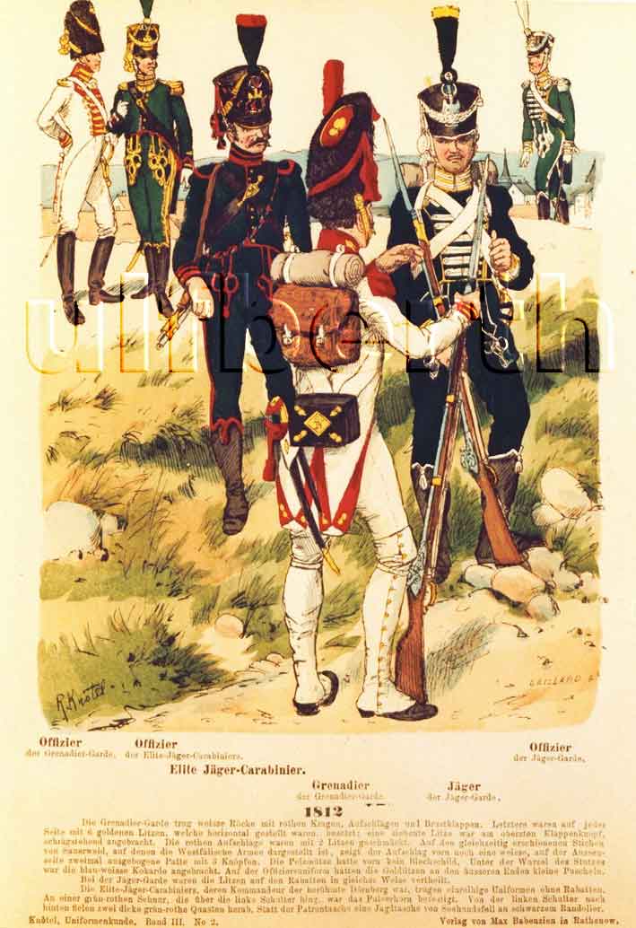 Chasseurs Carabiniers, ein Elite Jäger-Carabinier-Bataillon, das der Garde zugeteilt war, Pistor'sche Jäger-Büchsen mit Hirschfänger / Doppelhaken-Aufpflanzung.