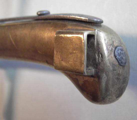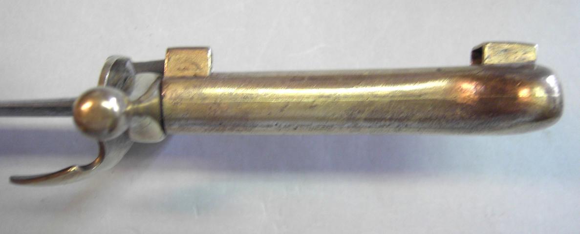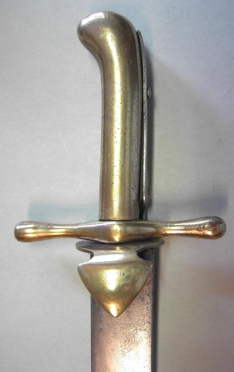 Dreiteiliges, gegossenes Messinggefäß bestehend aus Griff mit zwei Hakenösen, gerader Parierstange mit verdickten Enden und zum Ort hin abgebogenem Stichblatt. Auf dem Griffrücken verschraubt die Arretierfeder mit Drücker. Gerade Rückenklinge mit Sitze in der Klingenmitte.