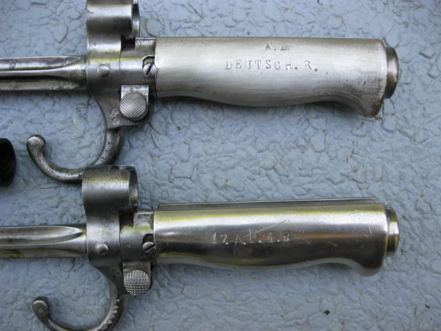 möchte hier 2 frz.Bayonette M 1886 vorstellen.Diese wurden von dt.Seite erbeutet u. auf der Grriffhülse gestempelt.Sonstige Abänderungen erfolgten nicht.