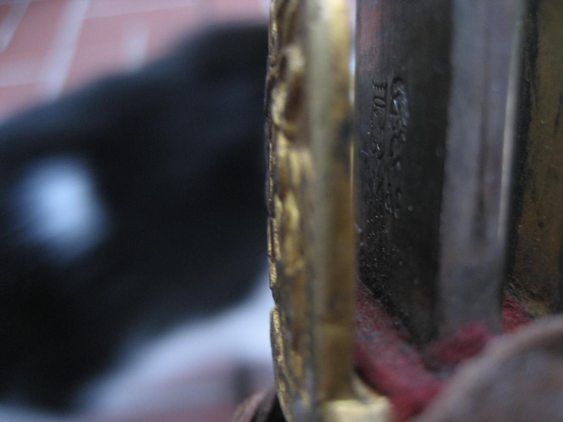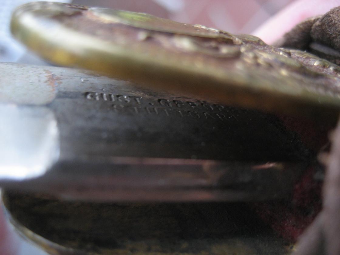 Die Realität ist eher trivialer Natur. Der Kavallerie-Offizier-Interimssäbel wurde hergestellt von W.K.&.Cie und vom Stuttgarter Militärausstatter (Schneiderei) Gustav Gförer vertrieben. Daher auch die beiden unterschiedlichen Firmenstempel auf der Fehlschärfe.