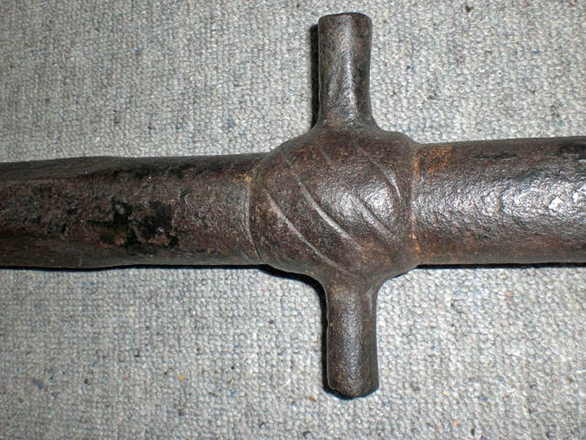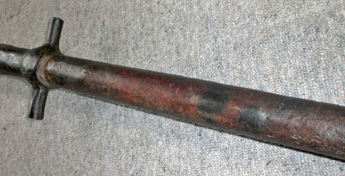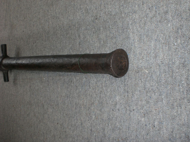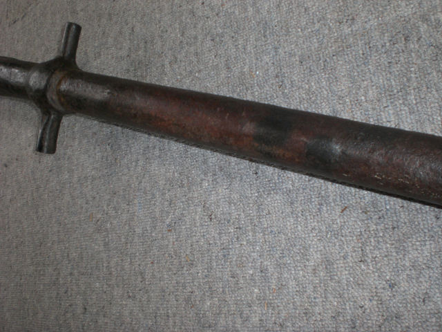 Hallo SAMMLER u.INTERESSIERTE...Dieses Kanonenrohr habe ich vor ca.15 Jahren erworben.Es wurde bei baggerarbeiten i.d.Nähe v. Lauenburg aus dem Hafenschlick d.Elbe geborgen,der äußere Zustand ,läßt dieses kaum vermuten.Ich habe nach einer "Oberreinigung",eine Antikwachsbehandlung vorgenommen u.das ist das sichtb.Ergebnis.Ich vermute,dass dieses ..gute..Stück auf einem Schiff eingesetzt war,event.mit entspr. Halterung für die Schildzapfen, an der Reeling befestigt gewesen ist.Länge ca.113cm.Kal.ca.3.3cm.Mündung,Trichterform.Zwischen dem Z.- Trichter u.den angeschmiedeten Schildzapfen das Rohr sechskantig mit schwach sichtb.Aplikation.LÄNGSACHSE durchgehender.Strich,welcher ü.die ganze Länge i.(Strichmännchenform)nach rechts u.links seitlich,abwärts verziert wurde(Tannenbaum-Muster)...Gewicht ca.15kg.Vorderes Rohr rund,unterhalb eine ca.10cm.lange zugeschiedete Aufbauchung(ehem.Ansatz,ähnl.e.Hakenbüchse) !? oder eine Aufbauchung durch Überladung,Verschmutzung ?!Bei der Nachmessung des Innenrohres zum Zündtrichter,der den Lampenschein nicht sichtb.machte,stellte ich fest,dass die Kugel noch vorhanden sein muß..Gemessener Abstand außen/innen.Etwas mehr "Aufhellung"würde mich freuen... Danke