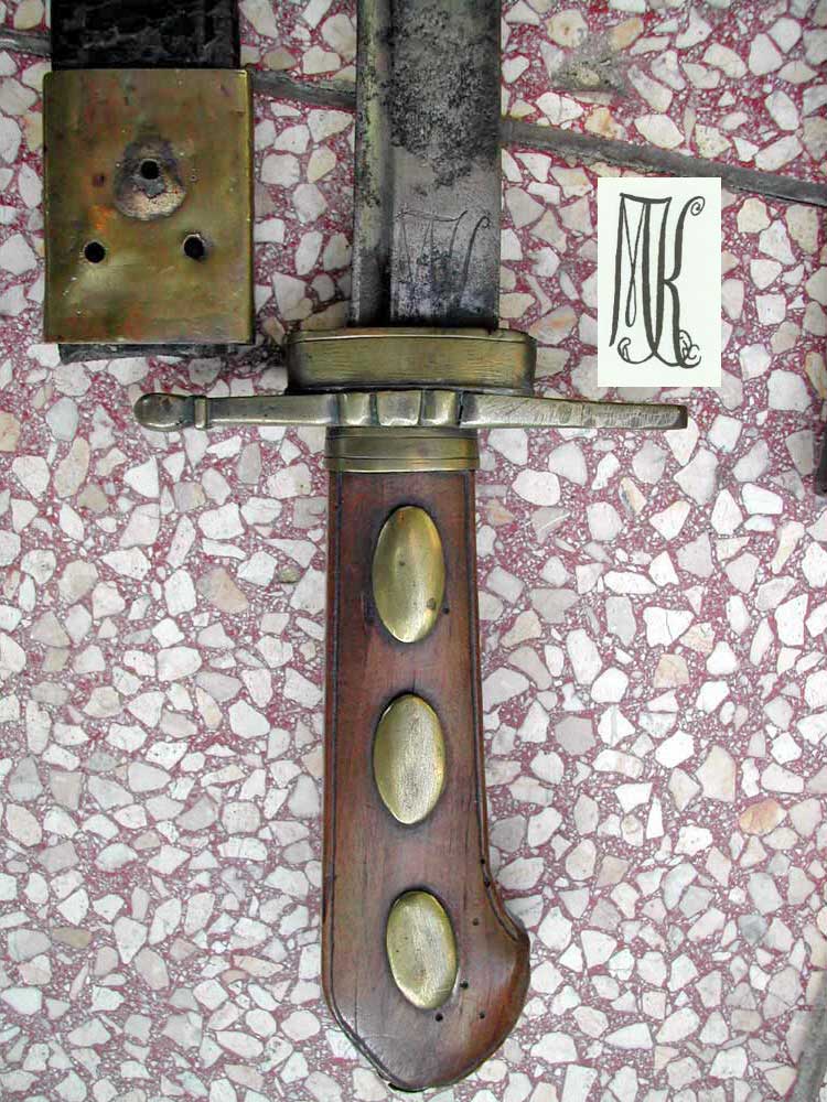 Für diesen Infanteriesäbel spricht die gekürzte Parierstange, das MJK-Monogramm auf der Klinge und das Mundblech mit den Resten des Tragebügels. Ein Tragehaken wurde nachträglich angebracht, ist nun aber ebenfalls entfernt.